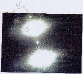 Abbildung 1a Auf der Aufnahme sind zwei große helle Flecke zu sehen - das zweigeteilte Zentralmaximum. Zwischen ihnen und daneben sieht man kleine helle Flecke, die durch Breggische Beugungsmaxima gebildet wurden. Auf dem oberen hellen Zentralmaximum ist sehr deutlich ein kleiner schwarzer Fleck zu sehen. In diesem Fall wurde das Negativ mit dem Elektronenbeugungsbild um Faktor 2 vergrößert. Der Abstand zwischen 2 Breggischen Maxima beträgt in der Umkehrung 2 A. Über die reale Vergrößerung des Flecks lässt sich nur schwer etwas sagen, weil die genaue Vergrößerung der Magnetlinsen bei der Durchführung des Experimentes unklar ist. |