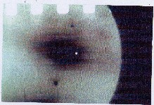 Abbildung 1b Eine vergrößerte Abbildung des Flecks auf dem Positivfilm. So reell sieht das Negativ aus, auf den die Elektronen fallen. Gut zu sehen sind der zentrale und die 2 Beugungsmaxima. Der schwarze Fleck (Abb. 1a) ist jetzt als weißer runder Fleck zu sehen. Die Abbildung ist umgekehrt, der weiße Streifen auf der Abb. 1a ist jetzt als schwarze Linie zu sehen. |