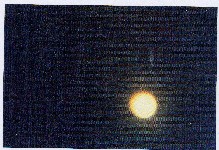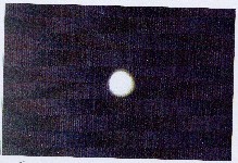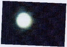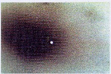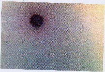 Abbildung 4a Eine der Abbildungen des Flecks, die mit Hilfe eines gewöhnlichen Farbnegativs in Durchsicht aufgenommen wurde. Der Bereich um den Fleck ist ein wenig dunkel. Dies kann davon bezeugen, dass einige Elektronen auf das Negativ gefallen sind bevor sie in die vom Fleck begrenzt Zone getreten sind. |